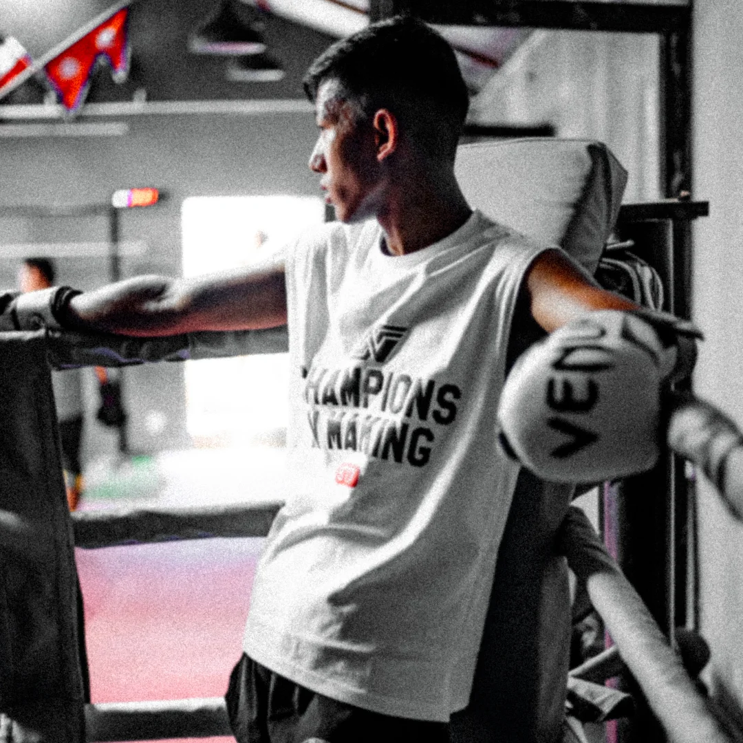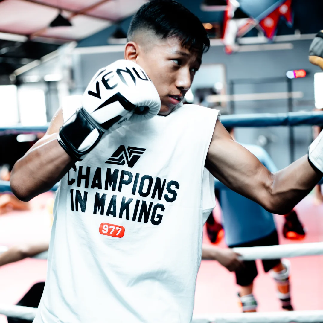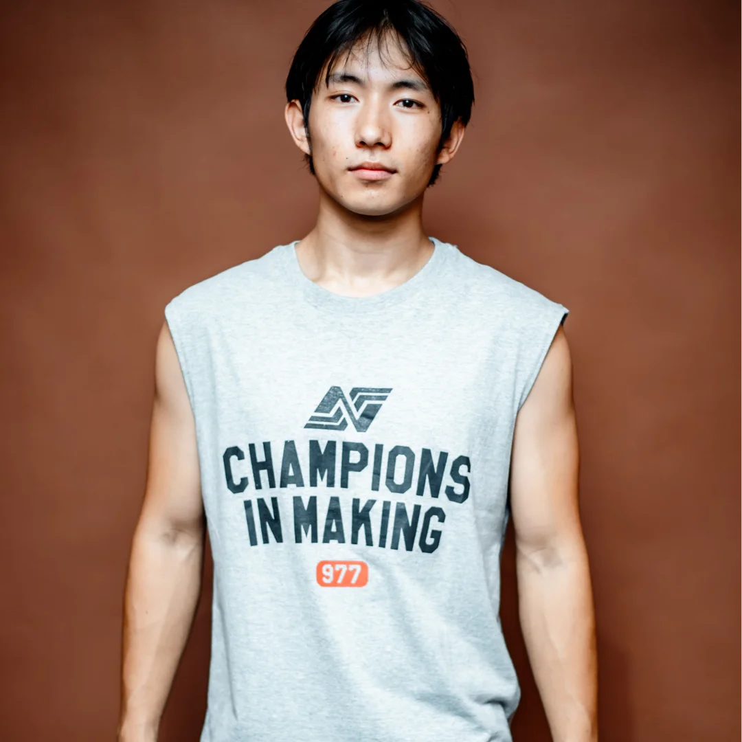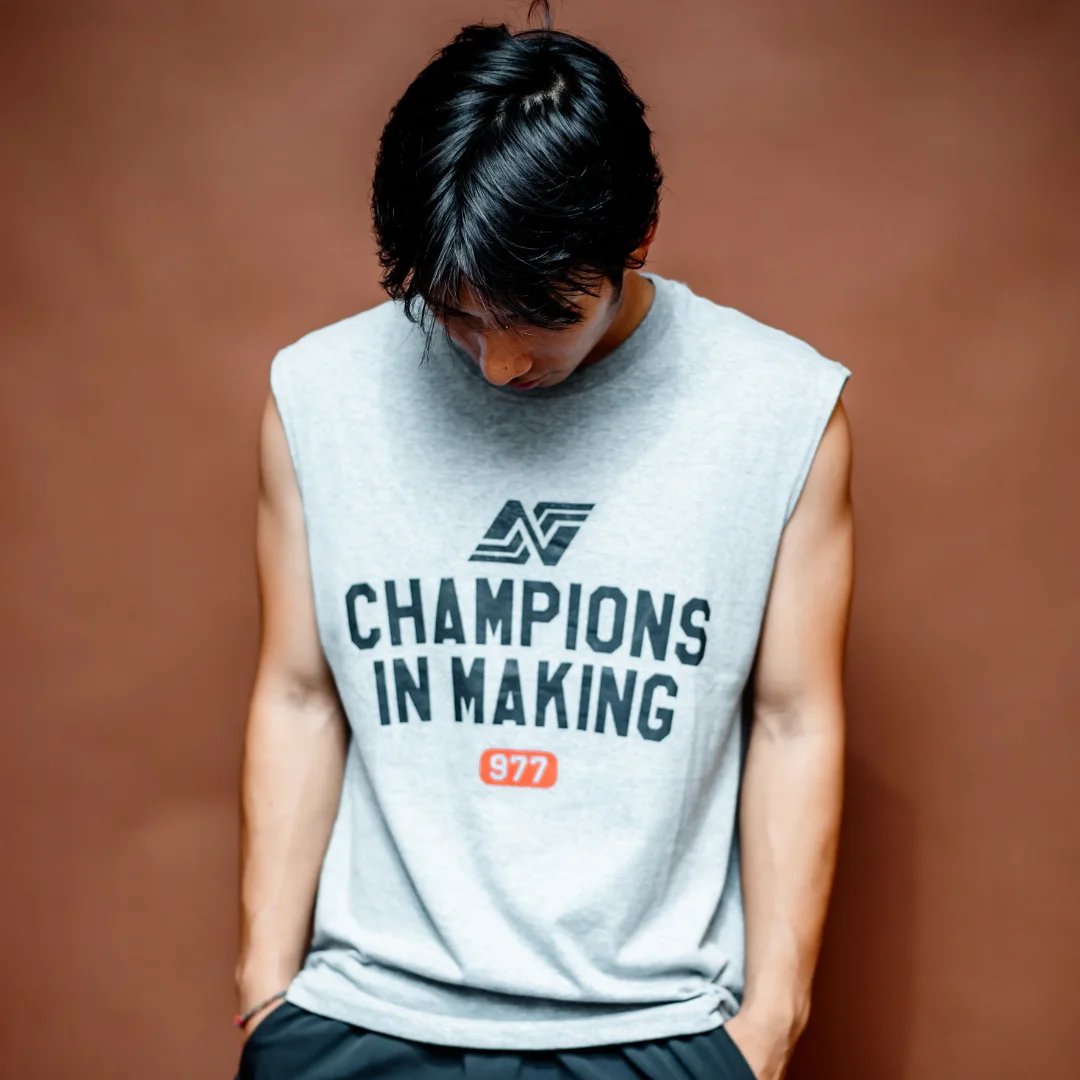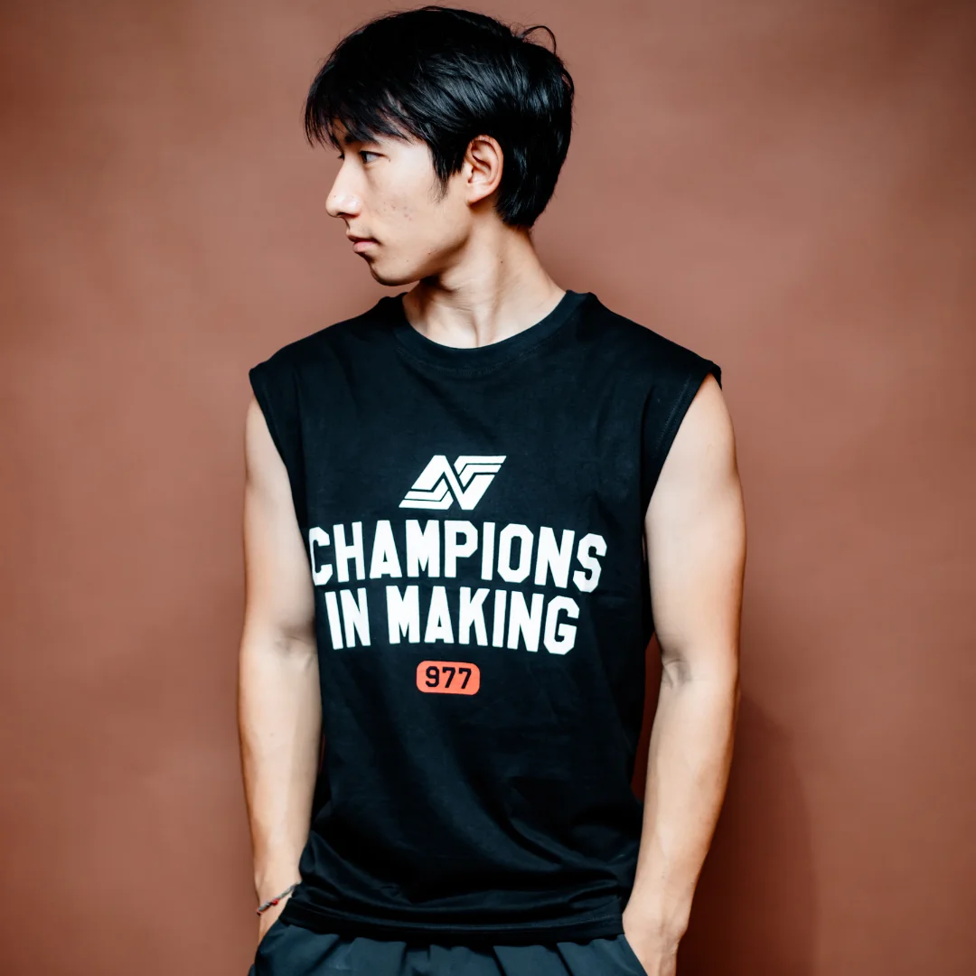 Set your heart ablaze with this muscle tee. Featuring fire printed CHAMPIONS IN MAKING premium cotton construction with raw sleeves to finish it off. This is the must-have piece of the season, get your hands on it today.